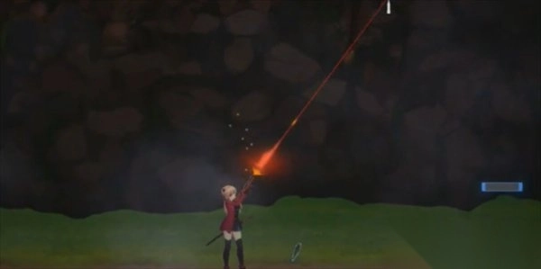 5. 之后走到光线特别暗的区域,花丛前方有个坑。击打花朵能让周围变亮,此时会有黄色激光从上方射来。等激光变成红色瞄准状态时,跳跃起来用剑攻击就能将其击退。要跳到花上的话,按住空格键即可。