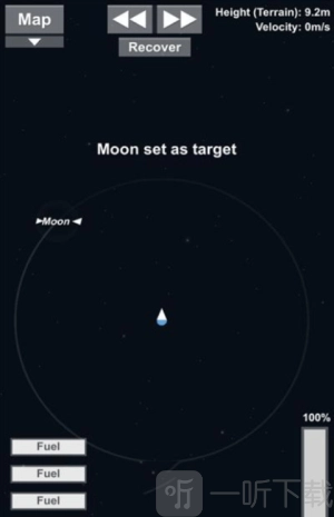 7. 在推进时候后在到达月球10KM的时间开启燃料动力,然后要注意下降速度,不用过快否则会坠毁。