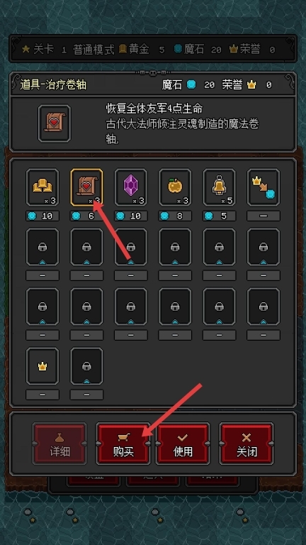 3、进入道具界面后,你会看到治疗卷轴这类道具。治疗卷轴的效果是能为全体友军恢复4点生命值,要是你有需要的话,点击购买按钮就能获得治疗卷轴了。