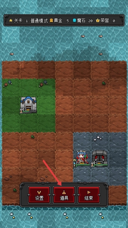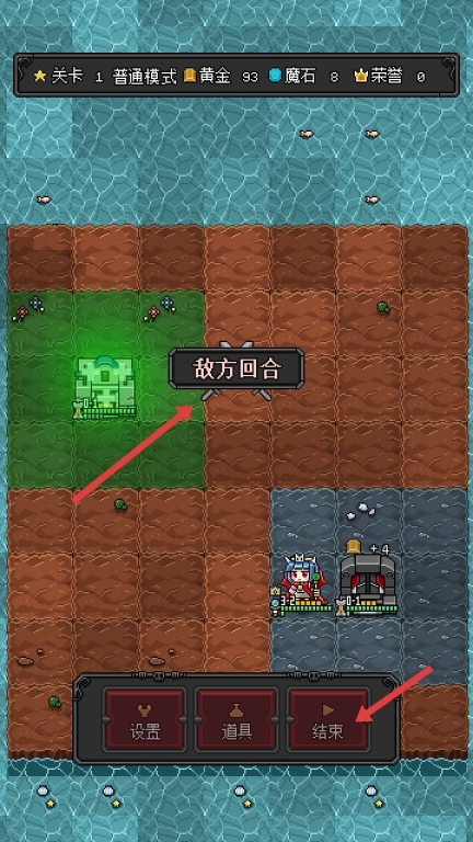 4、完成道具相关操作后,界面会显示“敌方回合”,这时点击“结束”按钮,就能进入敌方行动的回合,推动游戏继续进行。