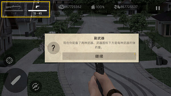 8、可以看到,我们现在的装备就是刚才所配备的两种武器,武器图标下方是每种武器的弹药量。
