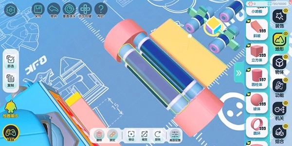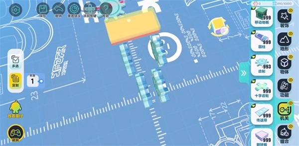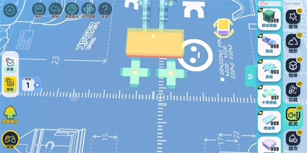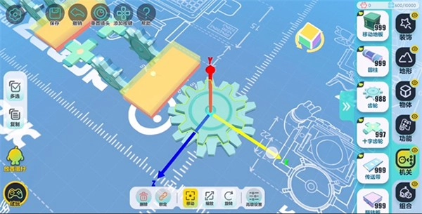 为了便于后续操作,在正式启动搭建流程前,要先把设置里的编辑视角切换成【上帝视角】。从机关分类里找到“齿轮”组件并拖动出来,就能完成“齿轮”的基础摆放操作。除了常规的摆放方式外,还能通过点击【旋转】按钮将“齿轮”调整为竖直状态,也可以借助【缩放】功能来改变“齿轮”的整体大小以及侧面的宽度。等尺寸调整合适后,点击左侧的【复制】按钮,就能对已经调整好参数的组件进行批量复制,从而起到节省操作时间、提升搭建效率的作用。