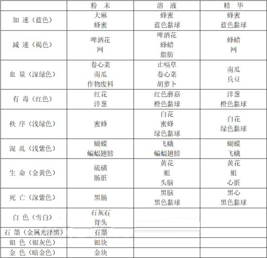 原料有八种常规类型:加速、减速、血量、有毒、秩序、混乱、生命、死亡,它们各自有对应的颜色
