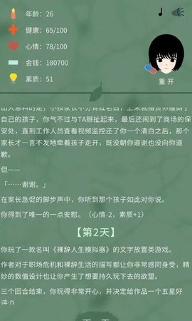 这款以“无业开局”为核心设定的文字模拟游戏,为玩家构建了一场别开生面的生活体验之旅。游戏内预设多重人际关系脉络,玩家可通过选择不同互动方式推动关系走向融洽;同时支持自定义角色性别与初始属性,不同设定将解锁差异化的人生路径与事件分支。丰富的随机挑战机制与高自由度玩法是其亮点——从日常逛街、规划旅行到尝试各类副业,玩家可在“脱离职场”的状态下自由探索多元生活可能性,在虚拟世界中体验“裸辞”群体的真实生存图景。