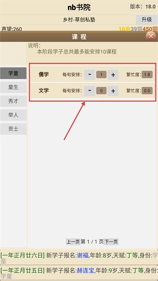 1、童生阶段要合理规划【儒学】与【文学】课程的设置数量,每旬对课程频次进行调整,以此提升学子的学识等各项能力。