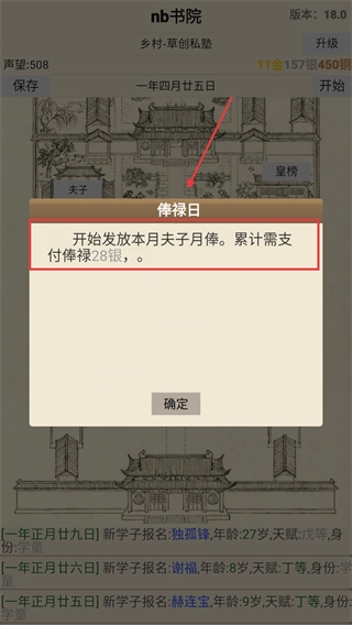 4、俸禄方面,每日需支付夫子月俸,要提前规划书院的银两储备,防止因资金短缺而影响夫子的留存。
