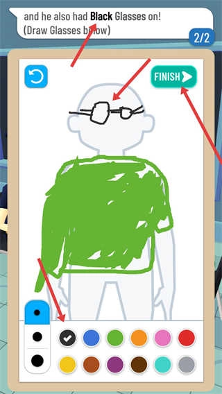 选择黑色,在人物头部画出黑色眼镜,画好后点击FINISH,结束此轮绘画环节。