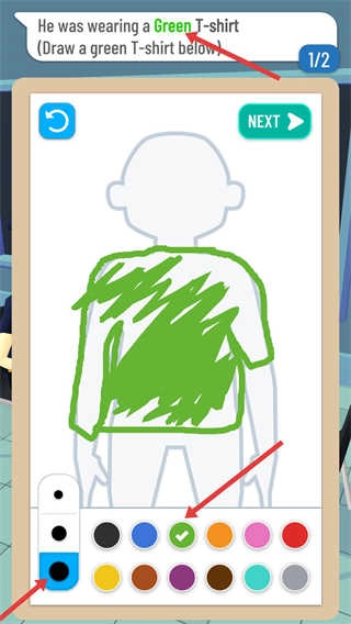 按照提示选择绿色,在人物的轮廓上画出绿色的T恤,完成这一步后点击NEXT按钮,就能进入到下一个绘画任务了。