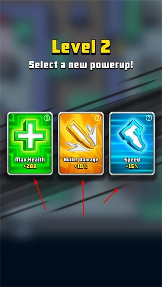 当关卡升级到新的阶段时,玩家能够挑选新的能力进行强化,以此来增加角色的生命值、子弹伤害或者移动速度之类的属性。