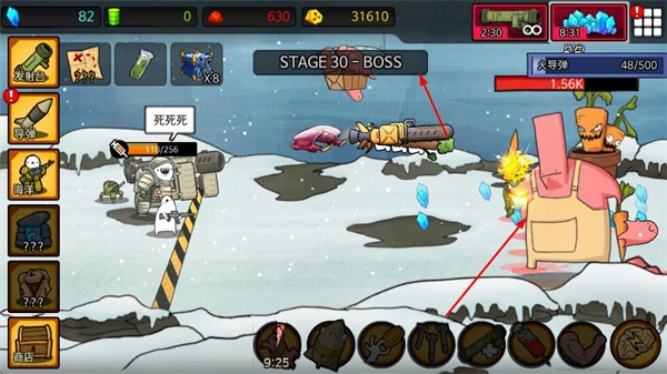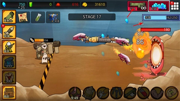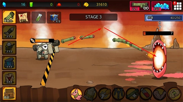 你需要操控位于左侧的机械角色,利用导弹这类武器去攻击右侧出现的各类怪物,像粉色的大嘴怪物以及BOSS级别的怪物都在攻击范围内。