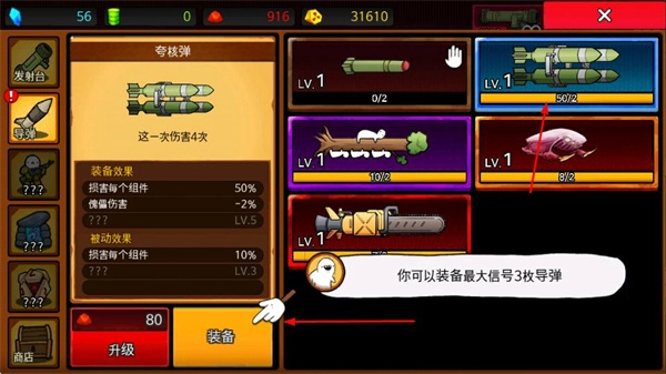 进入导弹选择界面后,你可以查看各类导弹的装备效果与被动效果,消耗资源对其进行升级,还能点击装备按钮,为机械角色装配更强大的导弹。
