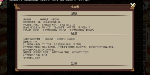 国库主要来源是各地收支,商业负责银两,矿业负责矿石,农业负责粮草,城市等级越高,收入也越高。内库主要来源是自宅产出+国库分成(分成比例占不清楚)-自宅支出-后宫支出-随从支出贸易与帝成差不多,高智力影响下限,高野心影响上限。不同点贸易的成功概率以及贸易需要花钱