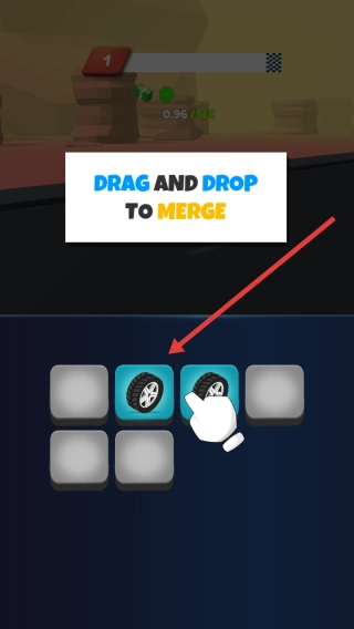在初始界面点击PLAY,即可进入合并玩法环节。按照“DRAG AND DROP TO MERGE”的指引,将轮胎或其他部件进行合并操作。