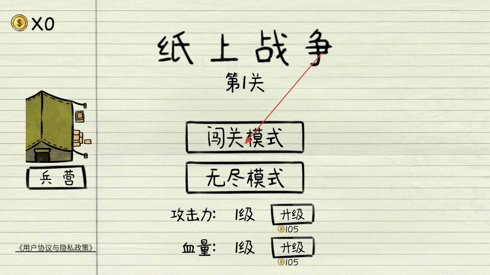 打开游戏纸上战争,选择【闯关模式】,开始第1关的挑战。