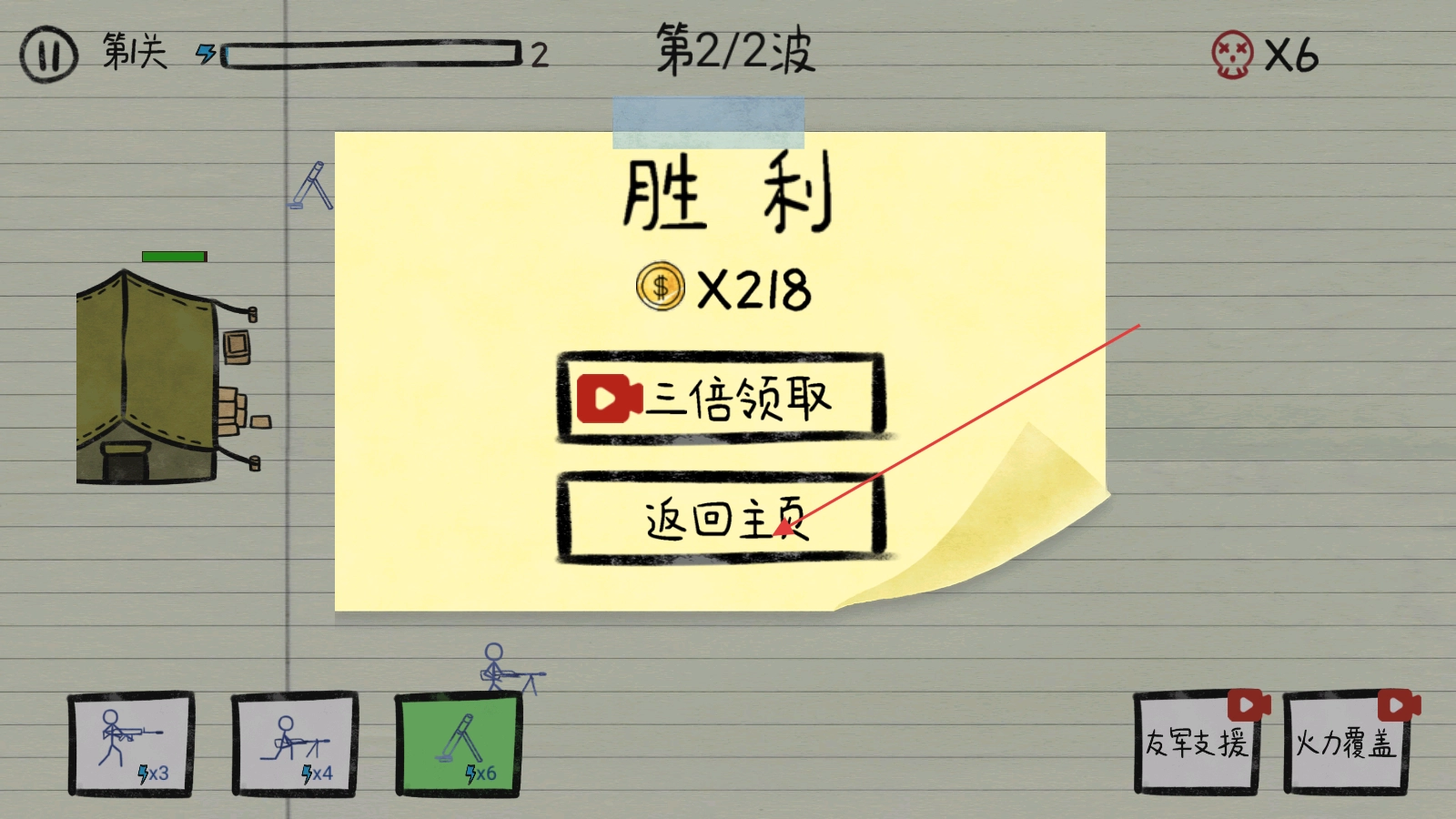 游戏胜利后,点击【返回主页】,结算金币。