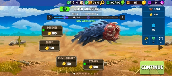 尽量收集更多金币,持续提升蠕虫的各项属性,使其能挑战更多困难关卡。