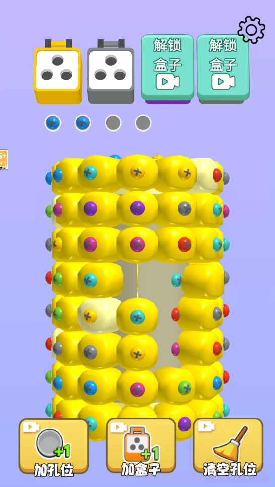 观察玉米上螺丝的颜色和其上方盒子的颜色,优先把同色的螺丝拧开并放进对应的盒子里,将盒子的三个空位填满就能让盒子消除。