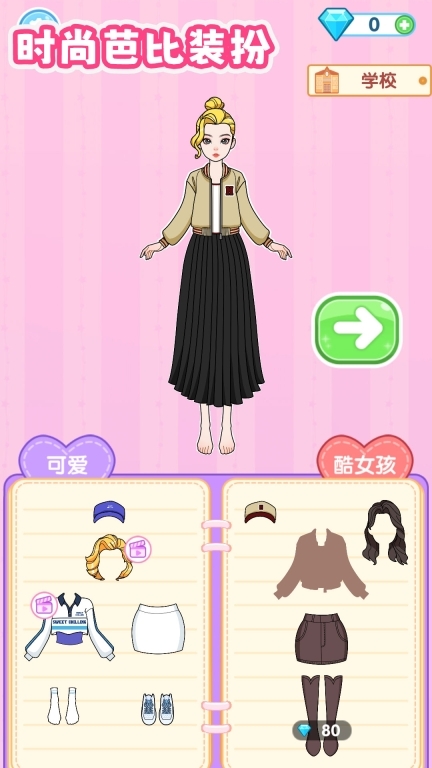 场景切换后,根据“可爱”“酷女孩”这类提示词选择对应的风格服装,就能快速搭配出契合该场景的穿搭。
