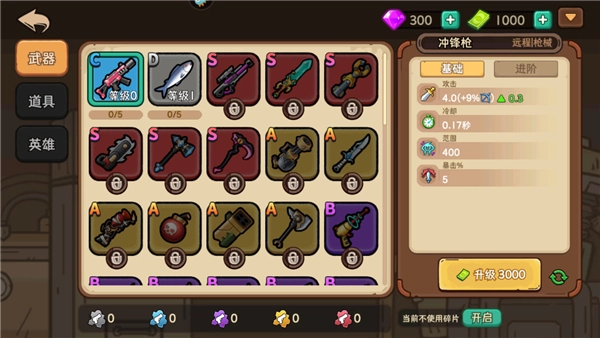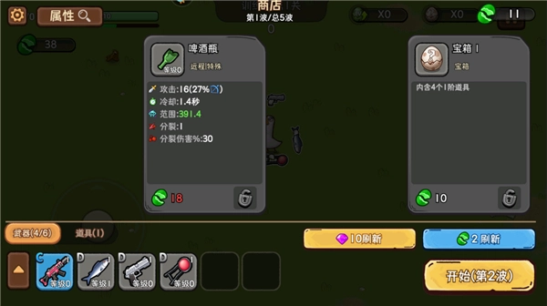 在击败每一波敌人或者时间耗尽之后,你可以选择武器和道具。