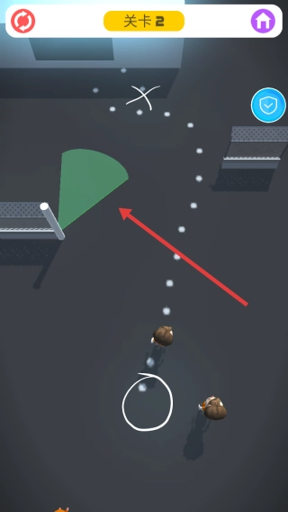 关卡2沿用原有机制,需沿着白点路径移动,借助场景中的遮挡物躲避警卫,与队员汇合后,按照箭头指示的方向突破封锁。