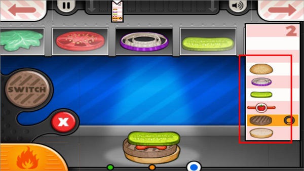 3、前往制作台制作汉堡,按照页面右侧菜单的要求,依次放入所需食材进行制作。
