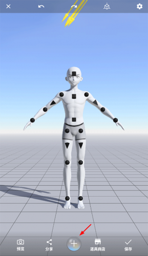 2、点击“创作”按钮,即可生成一个初始的建模形象。 3、拖动建模身上的控制点,就能调整它的肢体动作。 4、点击屏幕也能对其他部位的动作进行调节。 5、商店里还有大量不同的模型等待你去解锁哦~ 二、角色更换方法 1、点击底部的“+”图标,然后选择你想要更换的角色。