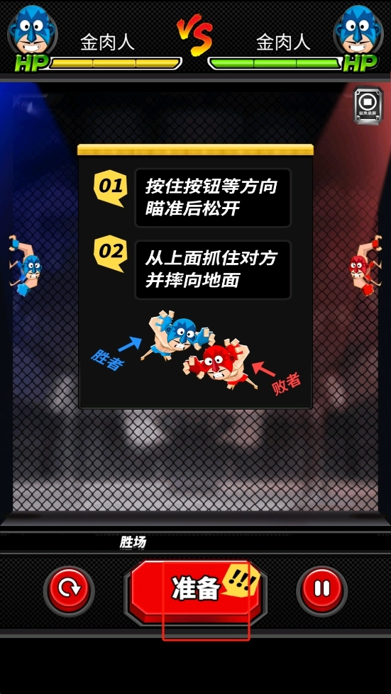 擂台操控对战:滑动屏幕控制筋肉人移动,点击屏幕两侧的拳脚按钮发起攻击,长按可蓄力释放重击,通过走位与攻击组合压制对手。
