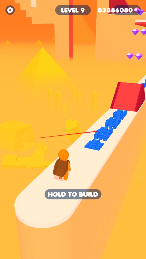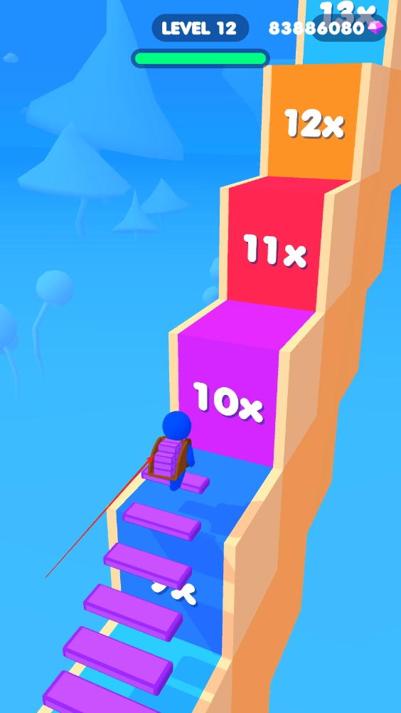 跨越所有阻碍后便能抵达终点,在终点的楼梯前,持续搭建楼梯直到身后的砖块耗尽,最终停在哪个阶梯,就能得到对应倍数的奖励。