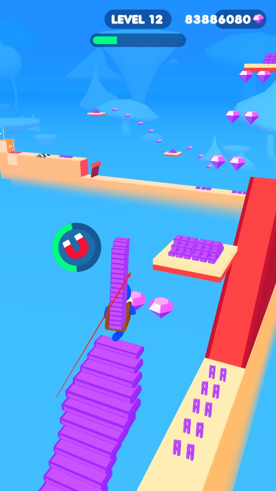 方块搭建的核心玩法是:以运用不同颜色的方块搭建楼梯为核心,玩家要依据赛道的实际状况灵活放置方块,这一独特的玩法不仅对空间规划能力提出了考验,还富有创造性。
