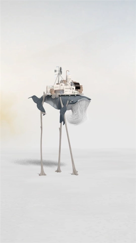 3、为了找到新的海洋生存下去,老鲸鱼被迫长出两条腿来行走,走出原先的海洋。