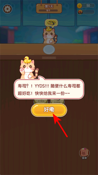 1、在对话界面找到红色箭头所指的“好嘞”按钮并点击,以此接受猫咪顾客的寿司订单,推动营业流程向前进行。