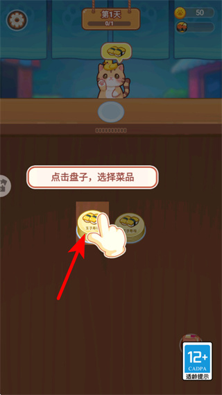 3、菜品备好后,点击红色箭头所指的猫咪顾客区域,即可完成上菜,满足顾客的需求。