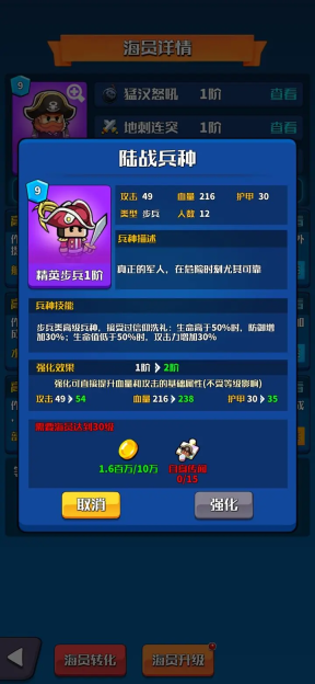 除了步兵和盾兵,其他兵种都没有护甲!所以前排用步兵会更耐揍,步兵是必不可少的。如果是零氪、微氪玩家,或者运气不太好抽不到合适卡片的航海士,可以先升级其他探险队长,只要比推荐等级高出2级,队伍数量再多出1队,就能轻松碾压对手了。