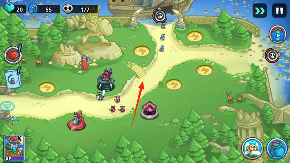 指挥左侧卡牌中的战斗闯关英雄,搭配技能与物品,攻打敌方塔楼建筑,达成关卡目标。