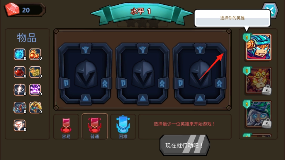 英雄选择功能位于“水平1”界面,操作时需消耗20颗水晶,玩家可从右侧已解锁的英雄卡牌中挑选角色,以此完成队伍组建。