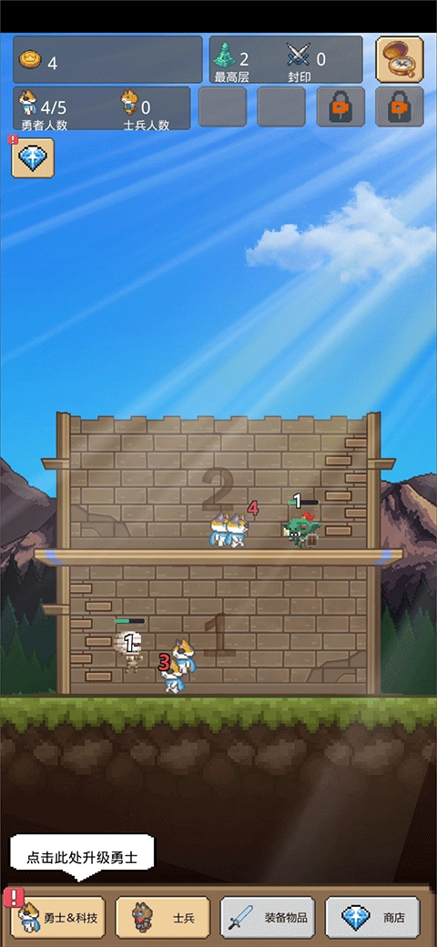 进入游戏后,玩家点击楼层,就能召唤出勇者与士兵,让他们去打倒妖怪。