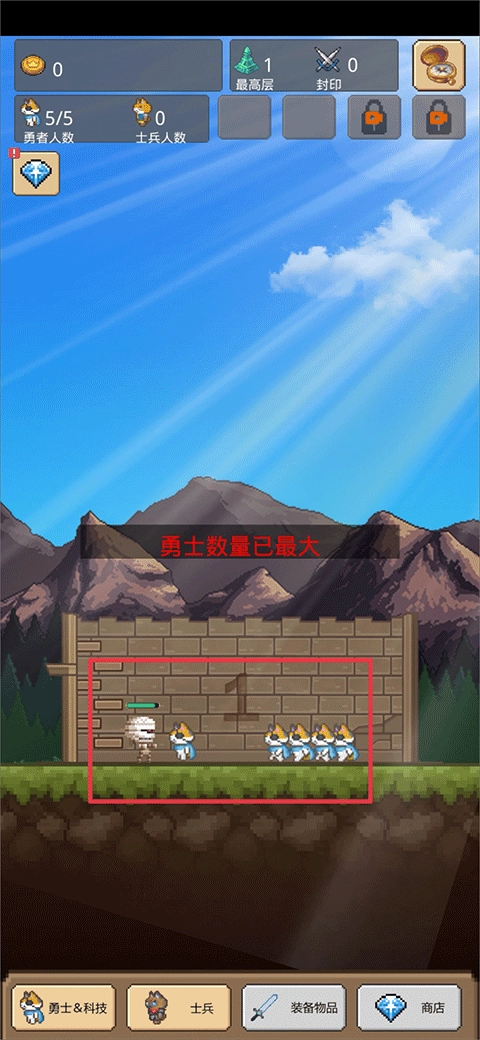 被击败的勇者会转化为金币,这些金币可用于提升勇士与士兵的等级、研发科技,还能解锁特殊兵种。