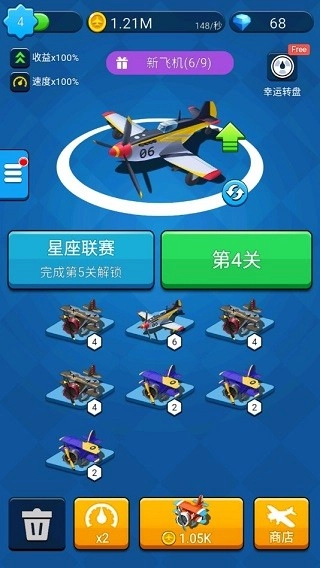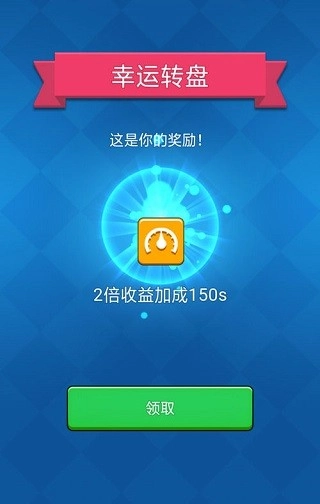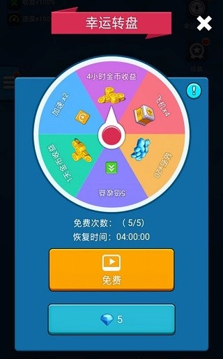 幸运转盘,从名字就能看出,玩家要靠锦鲤附体般的好运气,在紧张又刺激的游戏模式里把奖励拿到手。这个转盘上有六个格子,里面分别放着飞机×4、收益加速×2、收益×5、钻石+20、金币收益×4小时、金币收益×24小时这六种专属奖励。