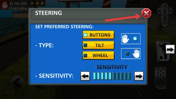 在渡口卡车司机模拟器的操控设置界面,点击右上角的红色关闭按钮,这样就能退出设置界面,进入驾驶关卡了。