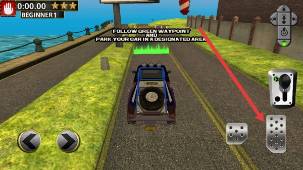 在游戏里,操控者得点击右侧的油门踏板来控制车速,跟着绿色路标走,把车停到指定区域就算完成任务啦。