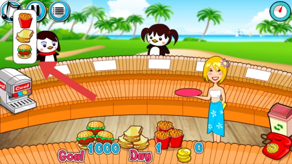 画面展示餐厅运营场景,有企鹅顾客和服务员,还标注着Day1等标识,玩家需要给企鹅顾客提供相应的食物,达成经营目标,感受餐厅服务与管理的流程。