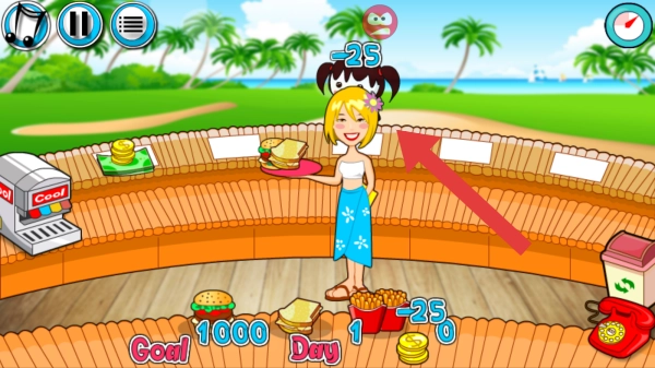 画面展示餐厅运营场景,包含服务员、食物,以及金币、数值变动(-25)等元素,玩家要为顾客提供餐点,达成经营目标,感受餐厅服务的完整流程。