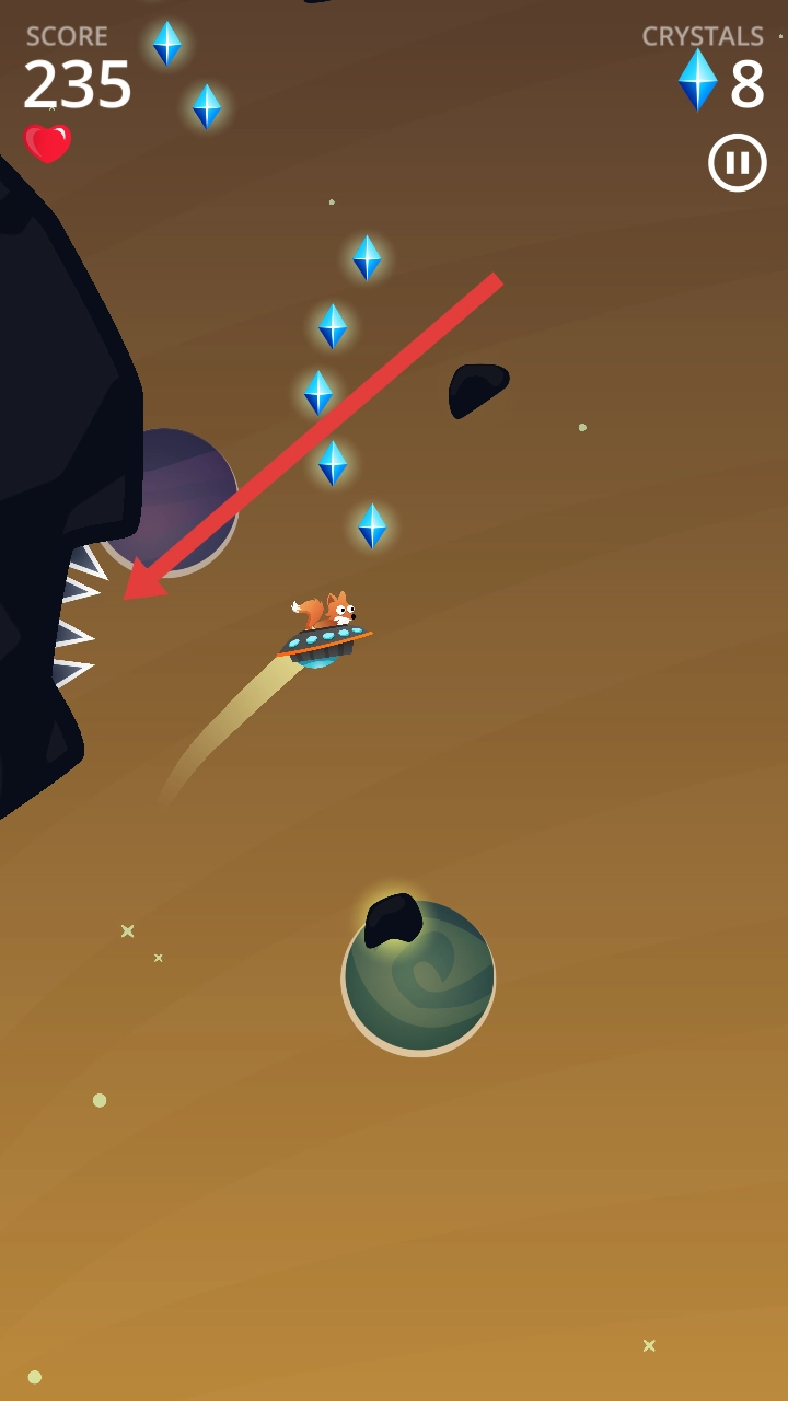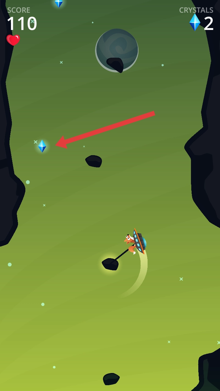 在小火狐飞行时,要引导飞碟靠近蓝色水晶并将其收集起来,这样就能增加分数和水晶的数量。