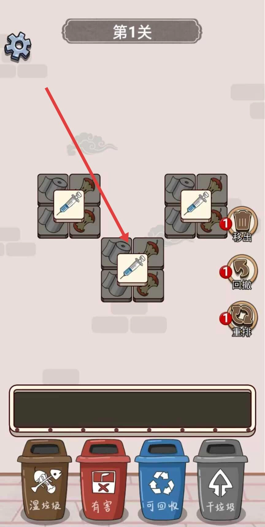 第1关需要识别syringe(注射器),它属于有害垃圾,将其拖入红色的“有害”垃圾桶,即可完成分类。