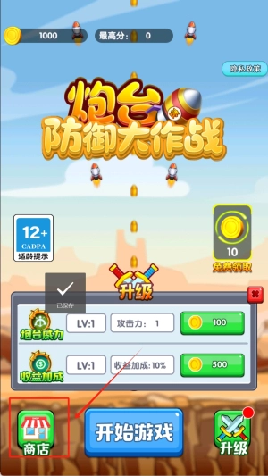 战斗结束后会进入商店界面,建议优先用100金币升级炮台以提升攻击力,或者花费500金币强化收益加成来获取更多资源。