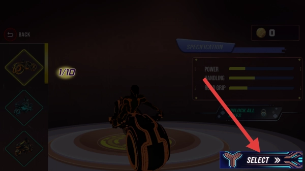 在摩托车选择界面,查看各项属性后,点击【SELECT】按钮即可选定该款摩托车;若想解锁更多车型,可借助【UNLOCK ALL】功能实现。