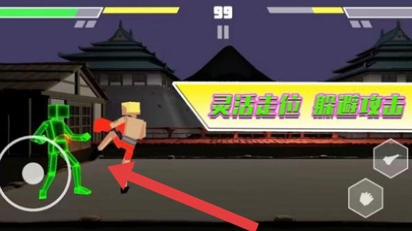 从“灵活走位躲避攻击”的文字描述以及对战场景来分析,这款游戏具有街机格斗的风格特点。玩家需要操控角色,通过走位调整位置、释放招式来展开战斗。画面呈现出像素风格或者低模风格,同时包含血条、招式按键等典型的格斗游戏元素。