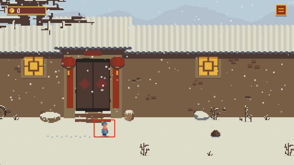 游戏开始时,你需要操控红色方框里身着蓝色服饰的角色,在雪地庭院中移动,通过靠近道具栏里的物品以及场景中的元素来触发互动。