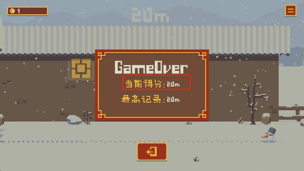 游戏结束后,查看红色方框里显示的当前得分20m,点击下方按钮,就能重新挑战以突破记录。