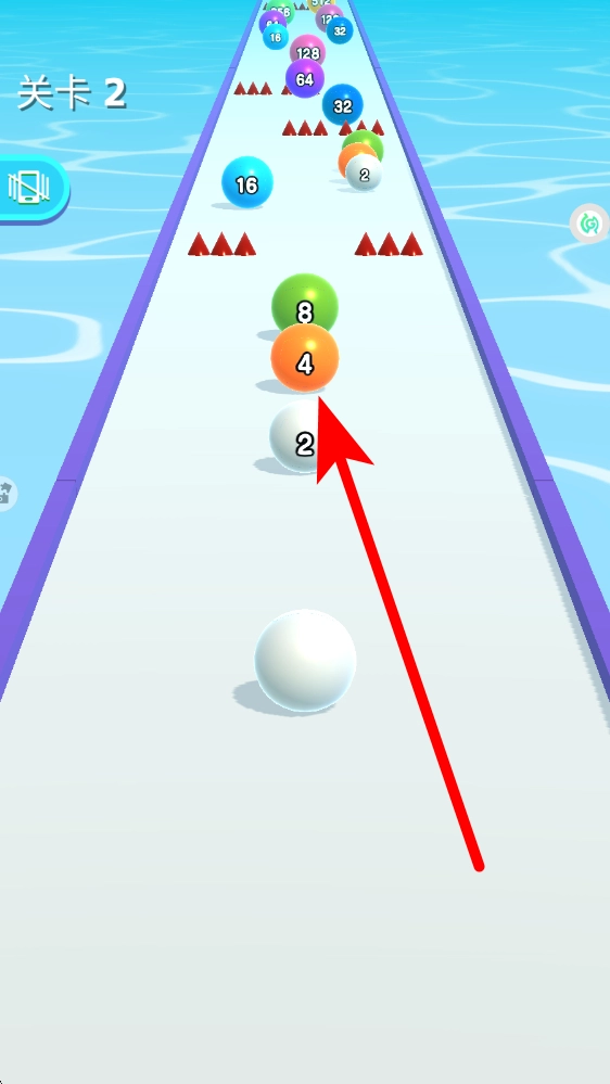 进入关卡,操控白球移动,撞击同数字弹球合并升级,如白球撞数字2弹球合成4,再撞4合成8,依此规律,逐步合成高阶弹球,提升等级。
